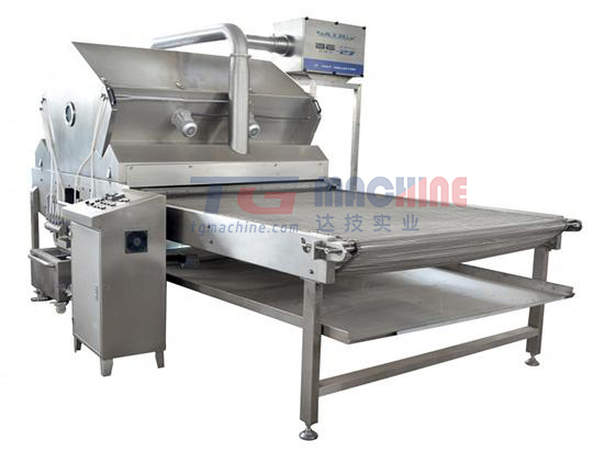 The material feeder is equipped with an automatic tensioning device and automatic deviation rectifying device to ensure reliable conveyance. The roller and groove roller are made of an alloy steel with a high hardness and no deformation. Parameters such as speed and dough thickness are easy to read on the screen and easily adjusted.