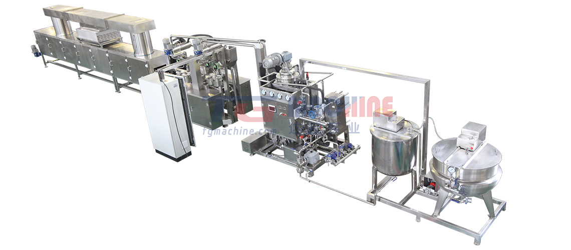 Designed for manufacturing candies of various colors and types, such as two-color candy, filled candy, and spiral candy, the hard candy depositing production line features a maximum capacity of a massive 1200kg/h. This production line consists of an automatic weighing system, vacuum cooker, cooling system, and demolding device. The entire production process is computer controlled which ensures the finished candies are precisely the right size, shape, and weight.